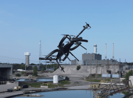 The Skygauge flies by tilting the rotors to move while the center body remains stable. The probe uses a force sensor to mimic the precision of the human hand to get accurate readings.